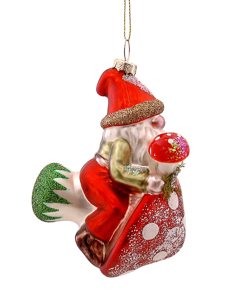 Создаст атмосферу сказочного леса прямо на вашей новогодней елке! Стеклянная игрушка выполнена в виде очаровательного гнома, уютно расположившегося на красочном грибочке. Благодаря ручной росписи каждая деталь игрушки выглядит ярко и выразительно — от веселого лица персонажа до реалистичного узора шляпки гриба.
