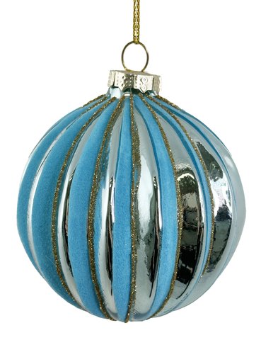 Этот стеклянный новогодний шар диаметром 8 сантиметров станет прекрасным украшением вашей праздничной ёлки. Изящная поверхность шара покрыта нежным голубым бархатным напылением (флок), придающим изделию изысканность и элегантность.