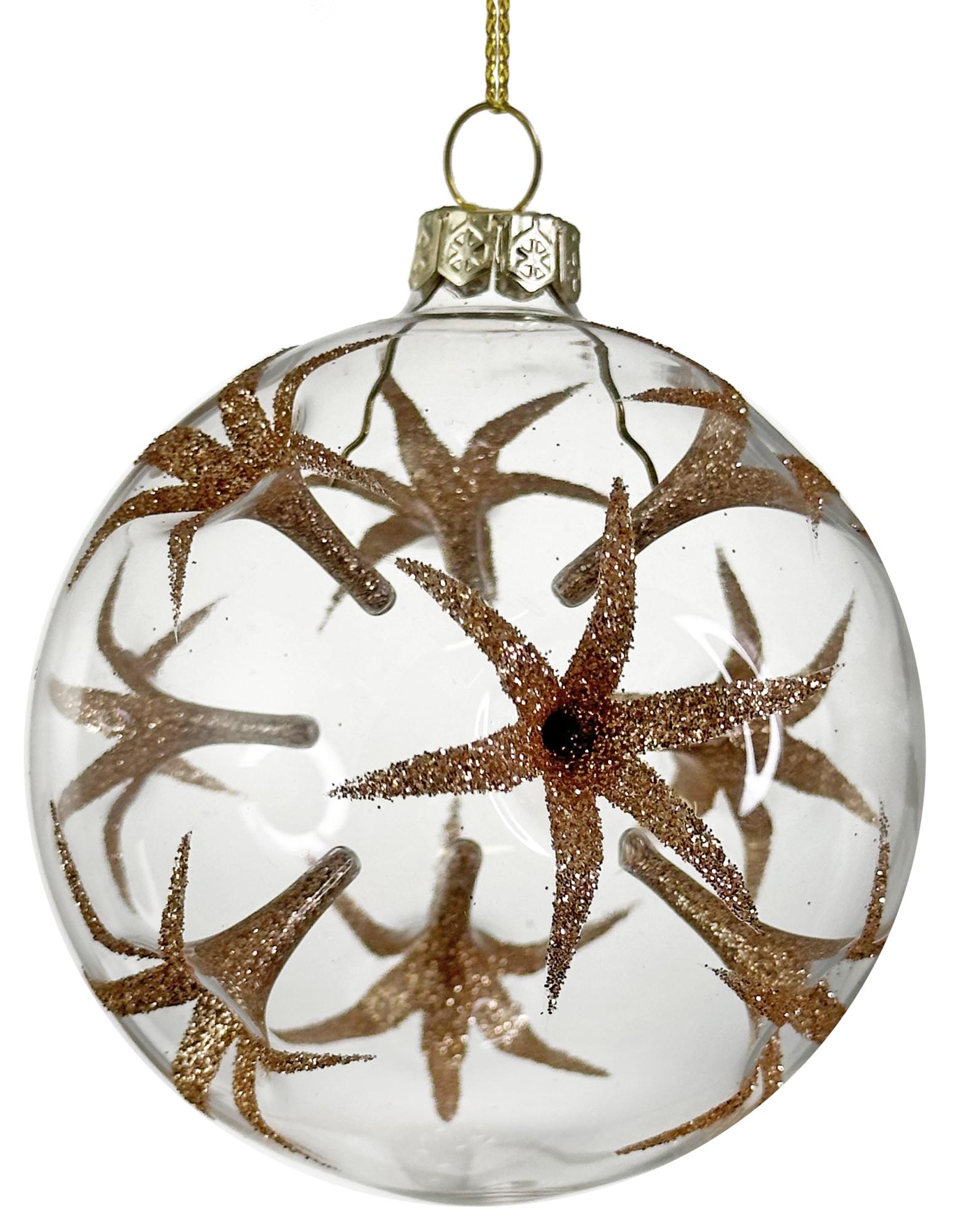 Шар имеет прозрачную основу, которая позволяет свету проникать внутрь и создавать красивые блики на поверхности. Декор на шаре выполнен в виде золотистых завитков, которые придают ему изысканный вид и делают его настоящим украшением праздничного интерьера.