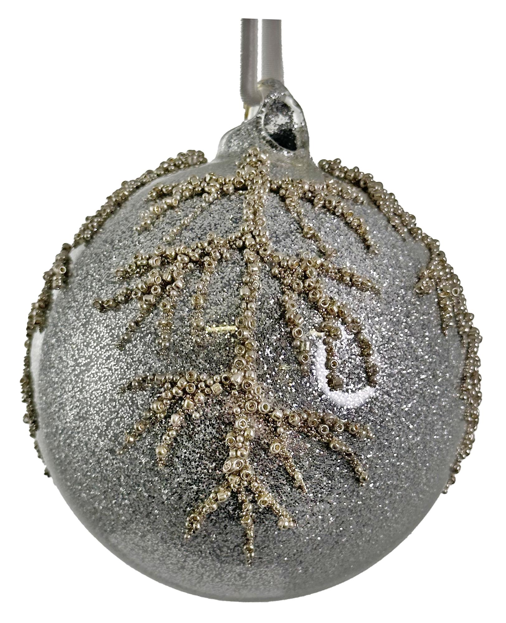 Основной цвет шара - серебристый, что придает ему особый шик и блеск. Декор в виде веток добавляет изделию объем и делает его еще более привлекательным.