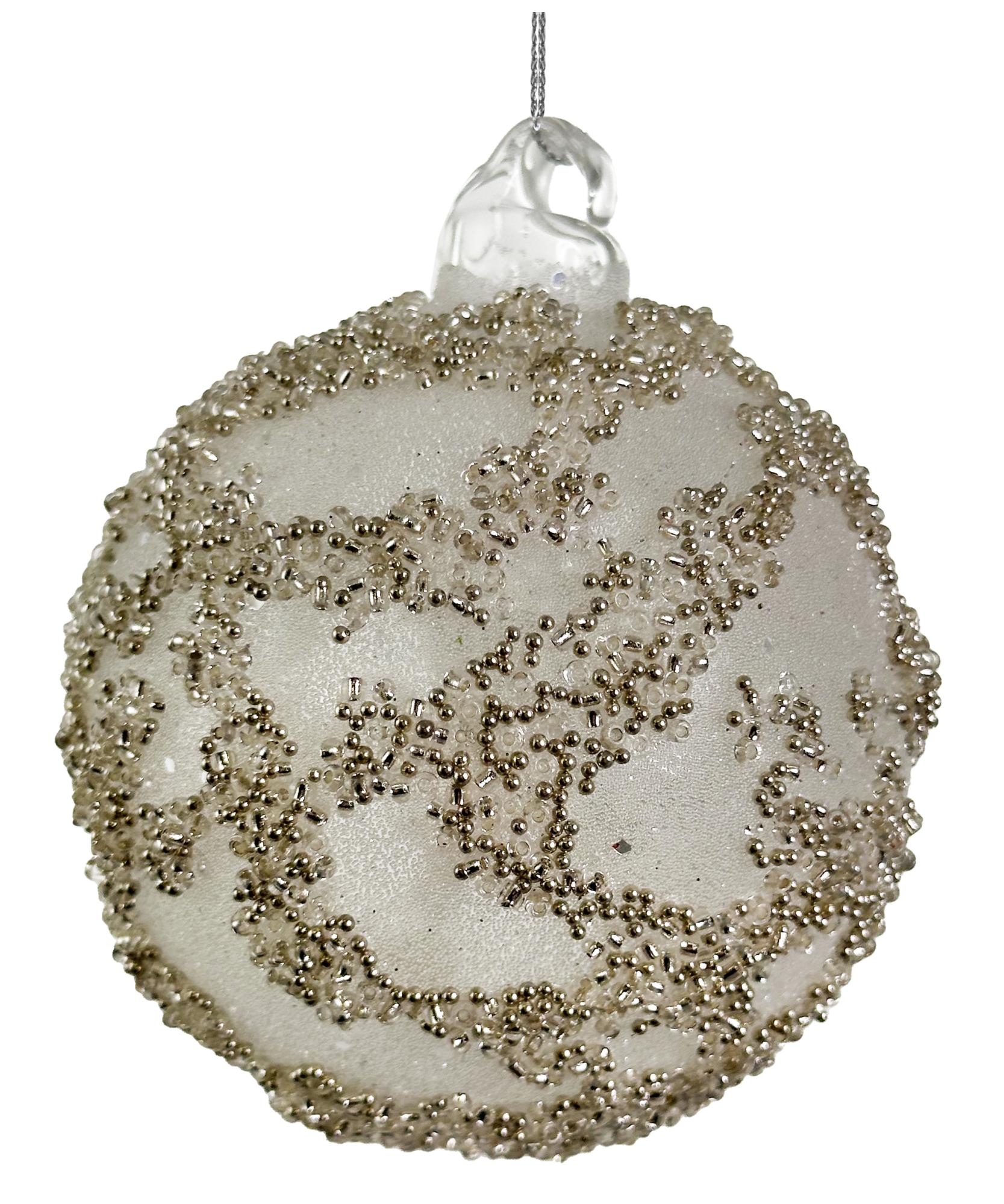 Шар имеет гладкую поверхность и прозрачную структуру, благодаря чему он отражает свет и создает эффектное сияние при освещении. Декор из бисера добавляет ему особый шарм и элегантность, делая его не просто игрушкой, а настоящим произведением искусства.