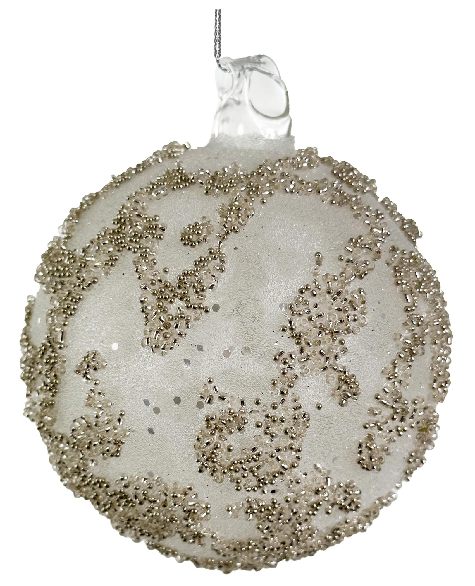 Шар имеет гладкую поверхность, которая прекрасно отражает свет, создавая красивые блики и добавляя блеска всему интерьеру. Декоративные элементы из бисера придают изделию оригинальность и неповторимость, подчеркивая его индивидуальность и уникальность.