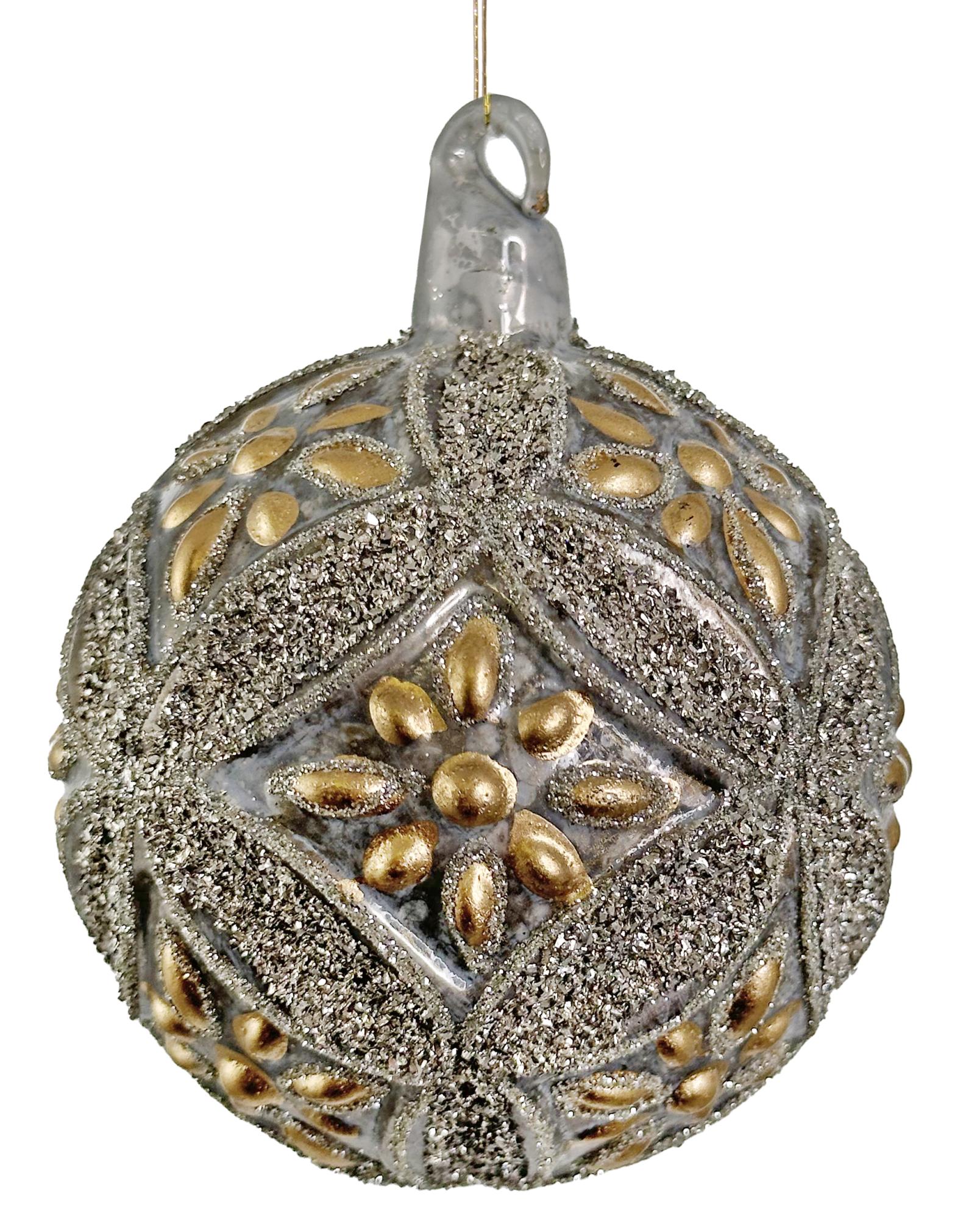 Шар выполнен из качественного стекла, что обеспечивает его долговечность и привлекательный внешний вид. Цвет шара - античный серый с золотыми и серебряными блестками, который придаёт ему особый шик и элегантность.