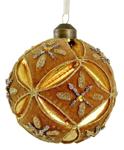 Создаст праздничное настроение и станет украшением новогодней композиции — стеклянная елочная игрушка «Золотой бархат». Изящный шарик покрыт мягким ворсом (флок), создающим эффект бархата, и украшен золотистыми блестками, придающими изделию роскошь и шарм.
